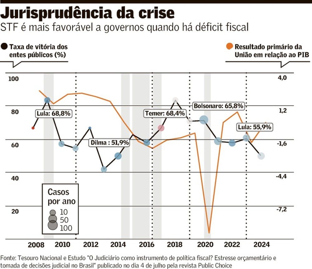 Essa expectativa de vitória, diz, dá um certo conforto para o Estado. “Sinaliza o que para o Executivo? Faça essa política. Ou vou mantê-la ou vou limitar os efeitos ruins para segurar o tamanho do problema.” O pesquisador explica que considerou o resultado primário acumulado nos 12 meses anteriores à data de julgamento dos casos para chegar à conclusão.