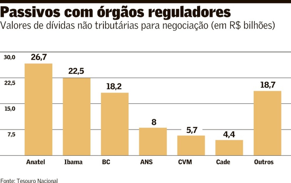 Com a possibilidade de negociar, o montante recuperável será superior, segundo fontes ouvidas pelo Valor. Atualmente, as maiores dívidas são, na seguinte ordem, com: Agência Nacional de Telecomunicações (Anatel), Instituto Brasileiro do Meio Ambiente e dos Recursos Naturais Renováveis (Ibama), Banco Central do Brasil (BCB), Agência Nacional de Saúde Suplementar (ANS), Comissão de Valores Mobiliários (CVM) e Conselho Administrativo de Defesa Econômica (Cade).