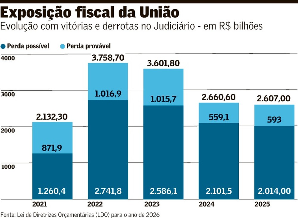 A União reduziu em 30,6% o risco de perdas com disputas judiciais em relação ao pico atingido no ano de 2022, de R$ 3,758 trilhões. Apesar disso, o valor ainda é vultoso. No fechamento de 2025, estava em R$ 2,607 trilhões, o que inclui o impacto de julgamentos indicados como de risco possível e provável (maior chance de derrota) para os cofres públicos. A informação consta no Anexo de Riscos Fiscais da Lei de Diretrizes Orçamentárias (LDO) para 2026.
